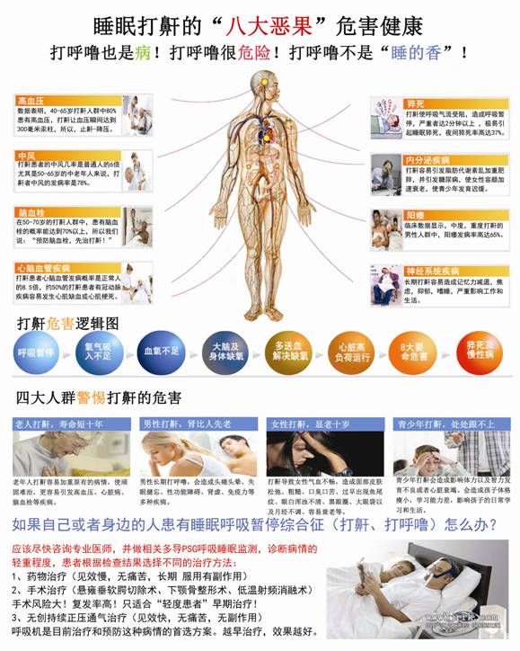 根据临床的医学研究证明:1.超过三分之一的普通高血压病人,和超过80%的难治性高血压的病人,都会同时患有睡眠呼吸暂停综合症。2。超过一半的充血性心衰的病人患有睡眠呼吸暂停。3,一个患有睡眠呼吸暂停疾病的病人,将会比没有患有睡眠呼吸暂停疾病的病人发生中风(脑血栓、脑溢血)概率高七倍。4,患有睡眠呼吸暂停的病人会比正常人出现交通事故的机率高六倍以上。78%的II型呼衰、肺心病、糖尿病患者同时患有睡眠呼吸暂停综合症。